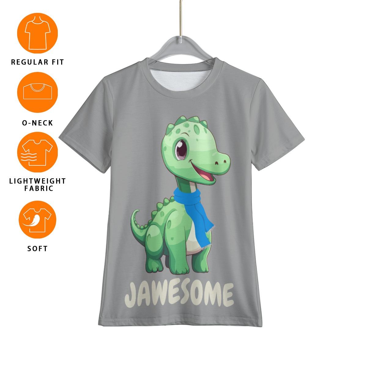 Let your child express their love for dinosaurs in style with the Scarf Mousey Kids T-Shirt - "Jawesome Dino."